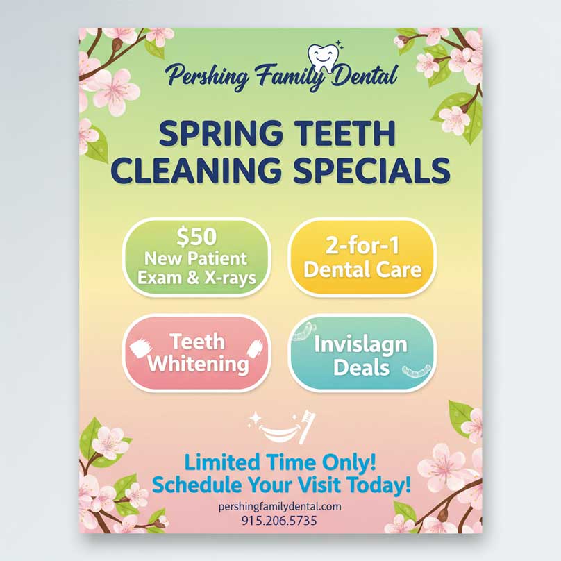At Pershing Family Dental, we want to help you achieve your best smile this season. To celebrate spring, we are offering exclusive promotions designed to make dental care accessible and affordable for our community.